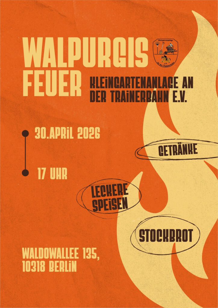 Liebe Gartenfreundinnen und Gartenfreunde, liebe Gartenkids! Liebe Besucher*innen und Gäste! Ihr seid wieder herzlich zu unserem Walpurgisfeuer am 30. April 2026 eingeladen. Euch erwarten erfrischende Getränke, leckere Speisen und Stockbrot am Feuer.